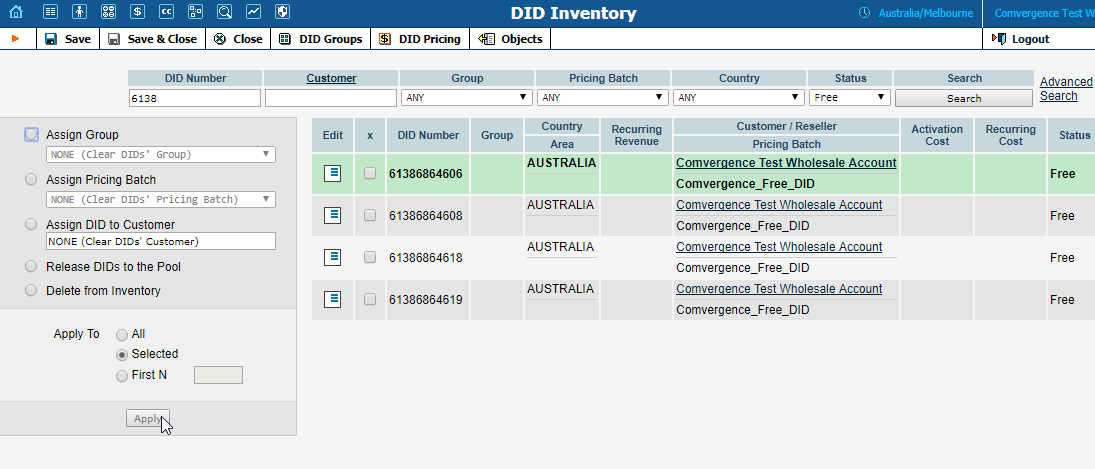 We have created a pricing batch called XXXXX Free DID for resellers that is a pricing batch with a charge of $0.00 for the customer. This will need to be assigned to any DIDs without a pricing batch.
