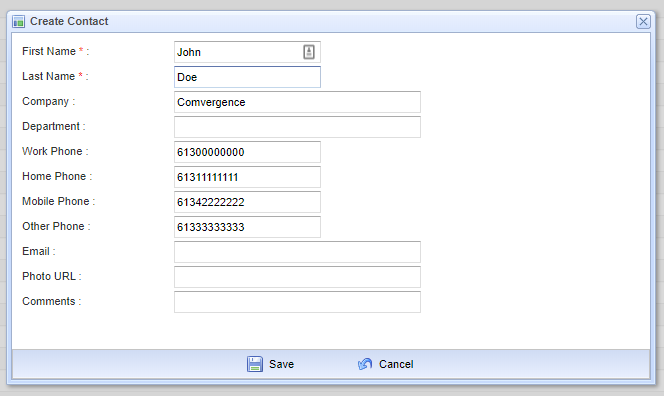 Add a single contact Click the “Add Contact” button to display a popup window. Firstname and Lastname fields are mandatory All other fields are optional (note that a contact without any phone number cannot be called) Edit a single contact Click on the blue edit icon at the far right of a contact Edit the fields as required Delete a contact or multiple contacts (Only external contacts can be deleted. Extension contacts cannot be deleted)